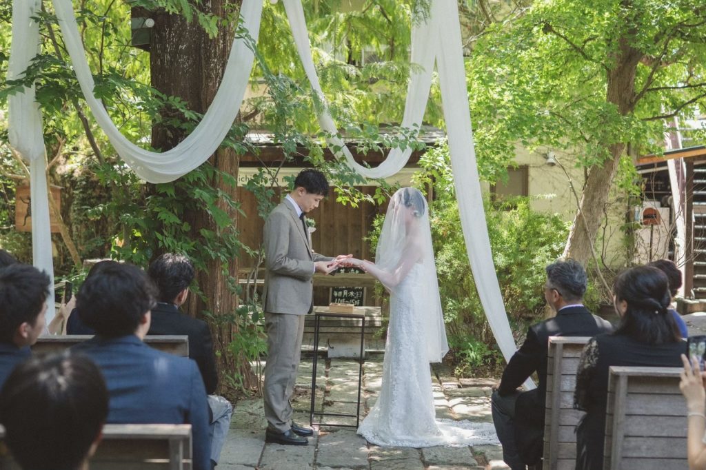 木漏れ日が差し込む中でのセレモニーは、ナチュラルで温かみがあり
